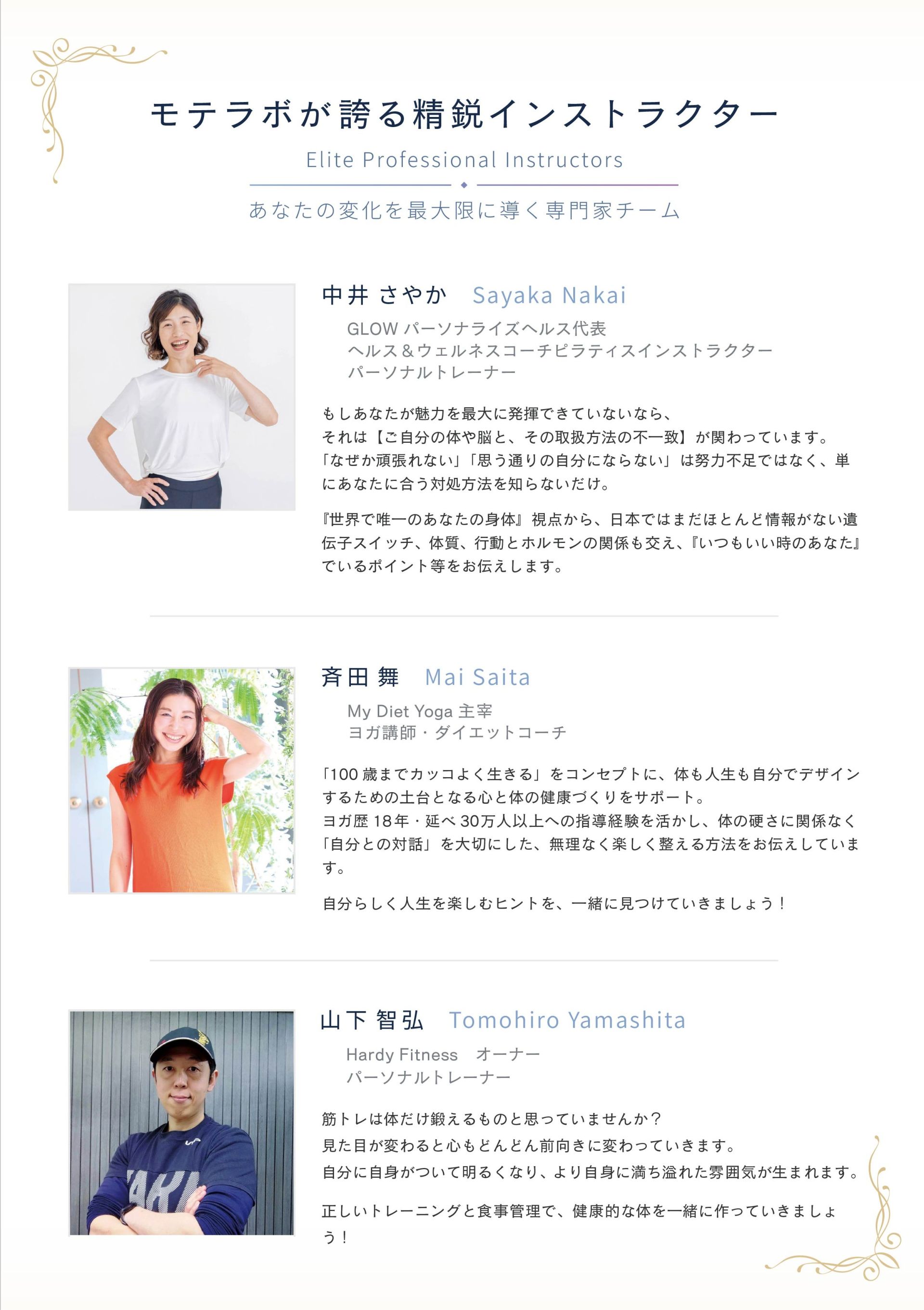 あなたはどんな姿で、どんな自分でありたいですか?周りとどう関わりたいですか?あなたが今変えたい何かの後ろにはより深い理由があり、これがゴールに繋がる変化を起こす原動力になります。そして一人一人の身体は違います。同じ出来事に対する心の反応も違います。自分を取り囲む全てのこと、無意識の選択一つ一つが影響します。だからあなたの状況としっかり向き合う時間を取って改善点と対策を洗い出しましょう。ただし精神論や根性論だけでは前に進めません。科学的なアプローチを用いて確実にステップアップしていきましょう。整った体はあなたのステージをさらに上げてくれます。